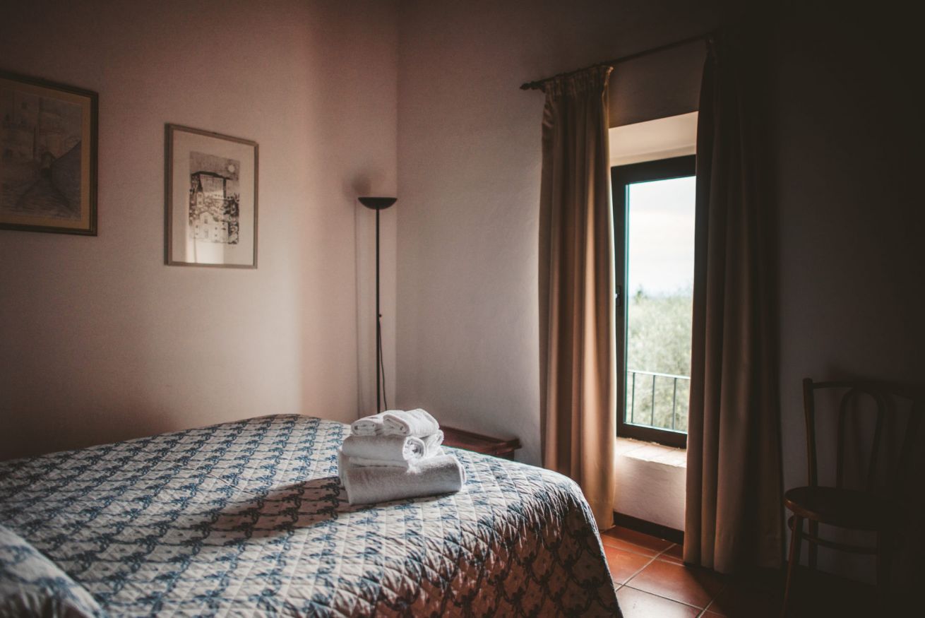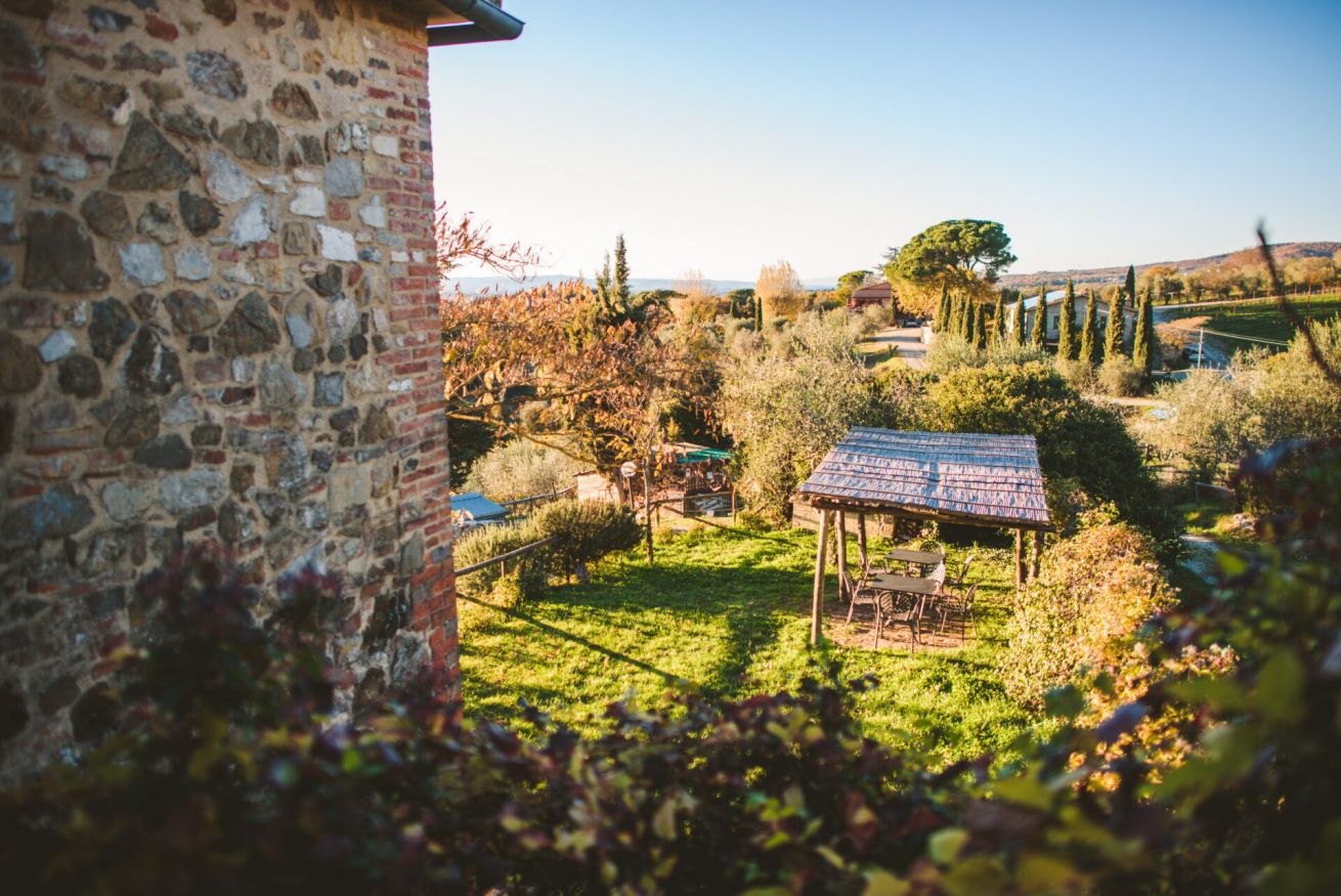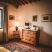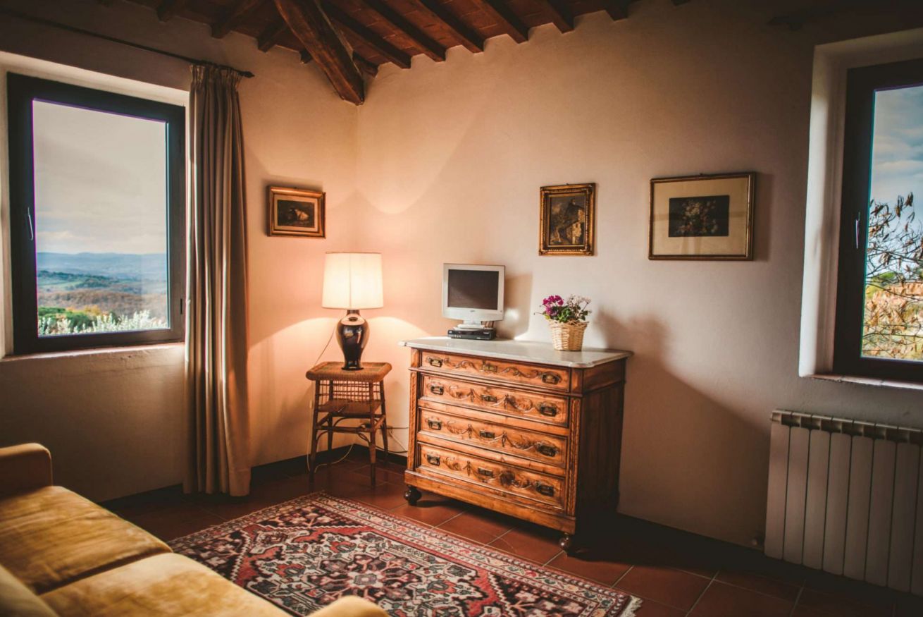 Trilocale con splendida vista sulle colline e vigne del Chianti Da una stradina di campagna privata si raggiunge l’ingresso salendo una tipica scala in cotto. L’appartamento è dotato di un soggiorno luminoso e una cucina spaziosa con bellissima terrazza panoramica. La zona notte è composta da due camere matrimoniali, da un bagno con doccia e vi è anche un ampio soggiorno dove si può aggiungere un divano letto matrimoniale. Spazio esterno attrezzato e privato, parcheggio. Piscina e ristorante a 200 m. Possibilità di letti aggiunti.