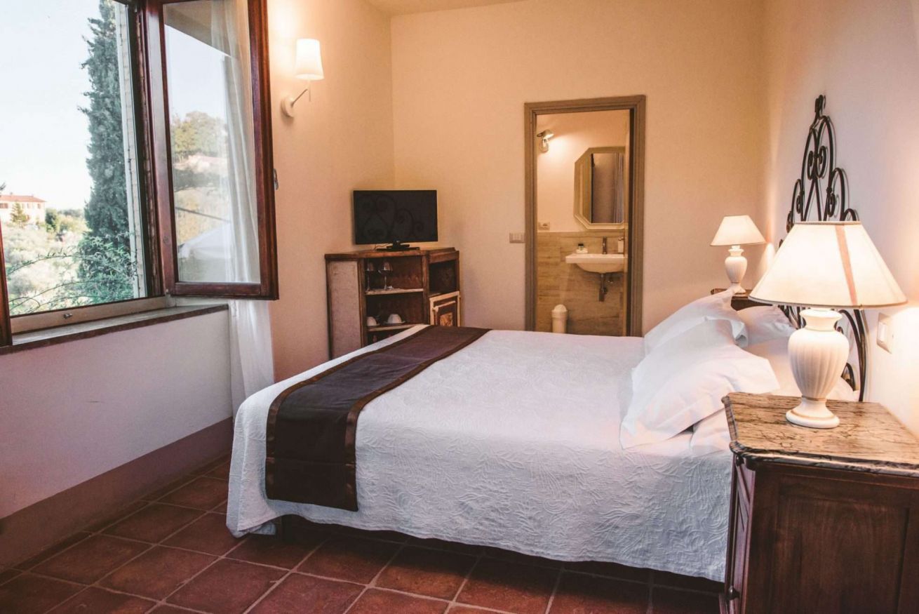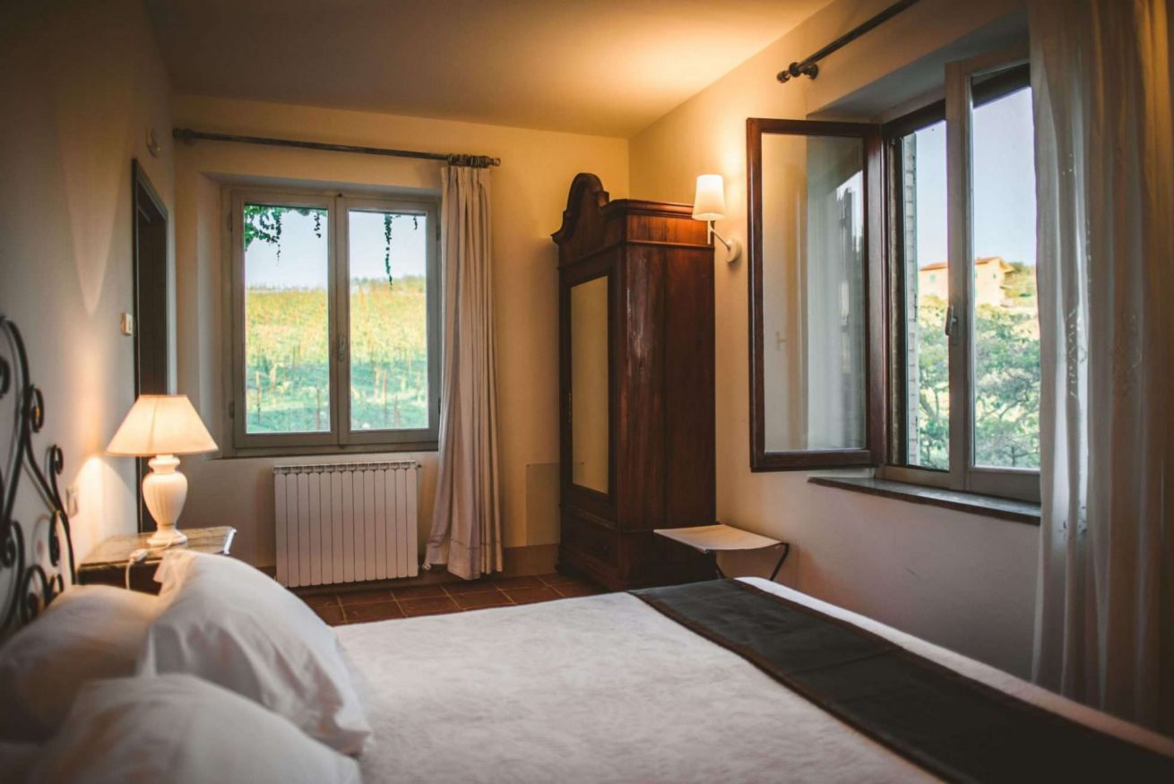 Camera con splendida vista sulle vigne e le colline del Chianti Luminosa Country Room, arredata con estro e cura nei particolari, in casale toscano. Al piano terra, composta da letto matrimoniale e bagno con doccia. Spazio esterno attrezzato, parcheggio. Piscina e ristorante a 50 m. Con possibilità di aggiungere un letto.